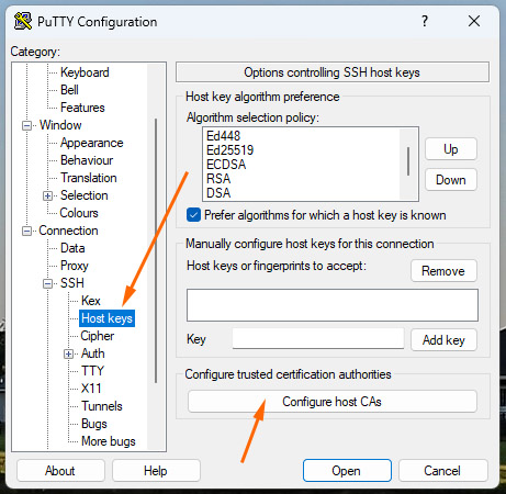 window choose Connection, then SSH, then Host Keys. Click "Configure host CAs."